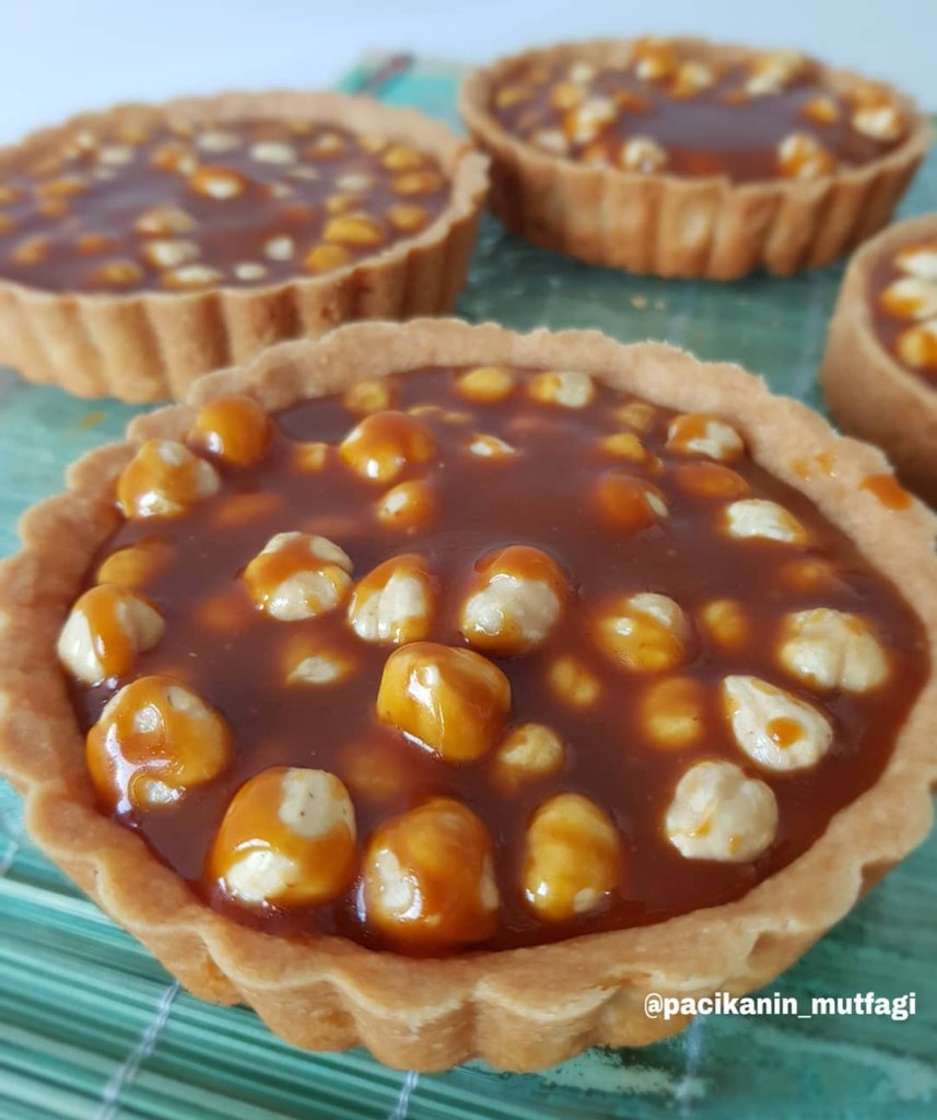 Tartların üzerine fındıklı karamelden koyup üzerine erimiş çikolata dökün.