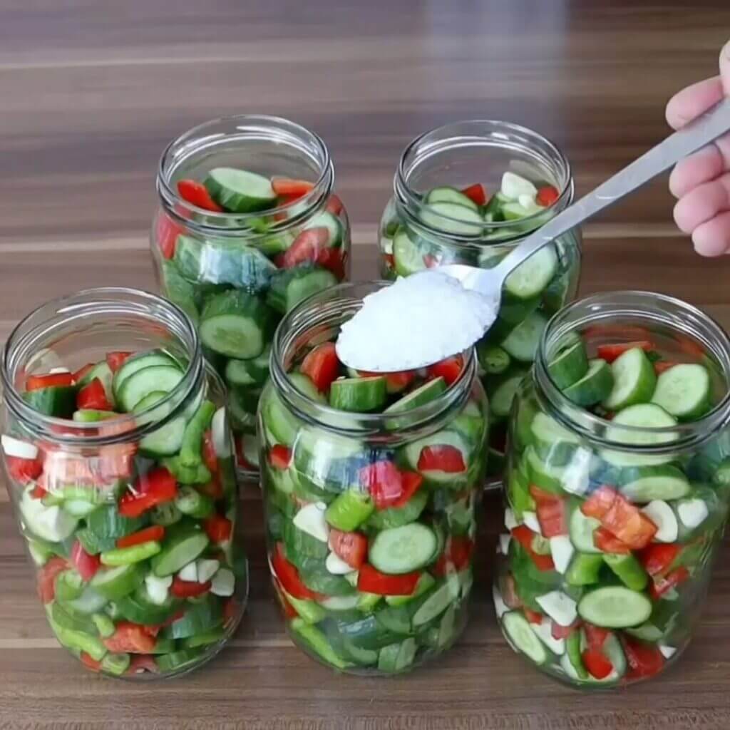 2. Kavanozlara ,doğradığımız sebzeleri alalim ve her bir kavanoza elma sirkesi, kaya tuzu ,şeker, limon tuzu ve kaynar suyu boşaltalım. Bıçakla havasini alip, tekrdan kaynar su ilave edip, kavanoz kapağını kapatalım sıkıca ve ters çevirip vakumlamasini sağlayalım.