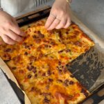 Tepsiye alın, üzerine rendelenmiş kaşar serpin (isteğe bağlı).