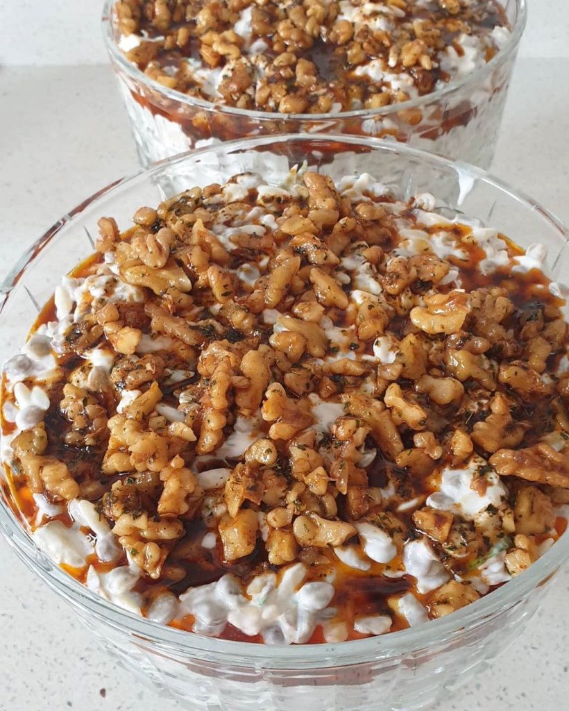 1 kaşık tereyağ biraz sıvıyağ, 1 tatlı kaşığı kırmızı toz biber, 1 su bardağı doğranmış ceviz içi.