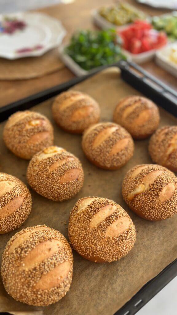 - Poğaçalara istediğiniz şekli verip kaşar peynirini yerleştirip önce pekmeze daha sonra susama batırıp yağlı kağıt serilmiş fırın tepsisine aralıklı şekilde dizelim.